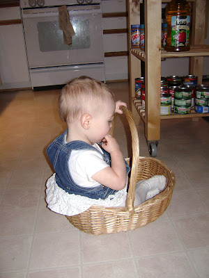 One of Joli's new favorite toys is a basket that used to hold fabric. Since she has discovered it, the basket has become something that she can carry around and put all kinds of things in. Tonight she decided that the basket was also the perfect size for a small child.