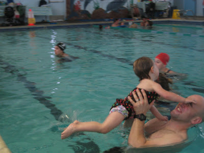 Eventually it got close enough to swim lessons that we decided to just go to the store first, which only took about 20 minutes and still left us an hour. So I took Joe over to Chris and Kacie's to see Charlotte! Joe and Joli played in the backyard while I held the baby girl and looked at pictures with Kacie! Chris got home and talked with us for a little bit and then it was finally time to go swimming. Joli was so excited! She got a little anxious when Joe went into the locker room to change, but then he came out and got her and off they went! Here are the benefits to having Daddy swim.
