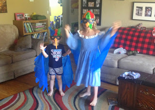 The last few days have been rough with Markus being sick. I had hoped that once we all had a good night's sleep we would feel better. I got up and made waffles, despite Markus' whiny communication. After I cleaned up breakfast, we got out the Kiwi Crates to do the crafts we'd been putting off. The first one was a lot of fun. It was a bird costume! They were both pretty excited!